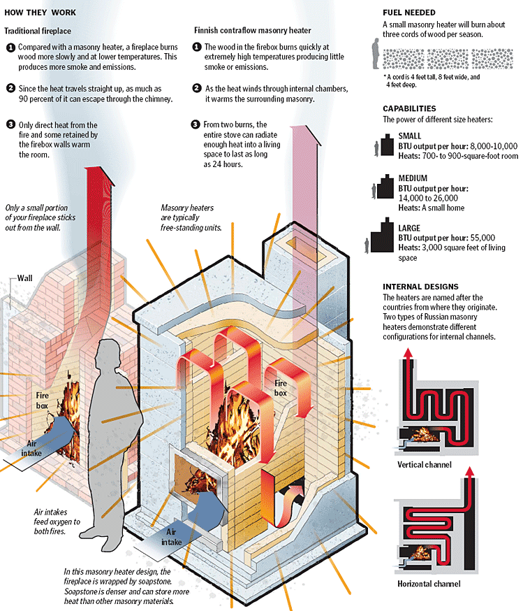 Mentre el foc està encès, el fum ha de circular per una sèrie de canals abans no troba la sortida cap a la xemeneia. D’aquesta manera la calor es queda acumulada a les parets de l’estufa.
